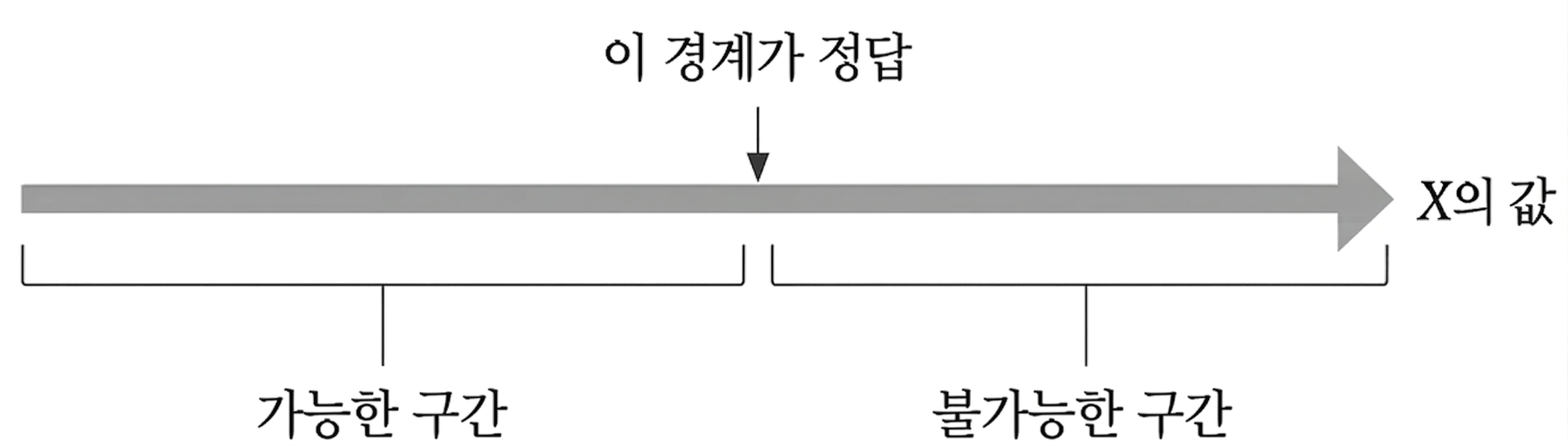 가능한 구간(✅)와 불가능한 구간(❌)의 경계가 정확히 하나만 존재 → 이분 탐색으로 경계를 찾을 수 있음!