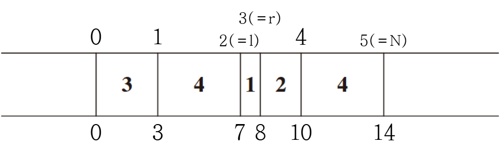 이 성질 덕분에, 모든 i에 대해 l과 r을 구하는 데 합계 0(N)이면 충분합니다 (투 포인터).